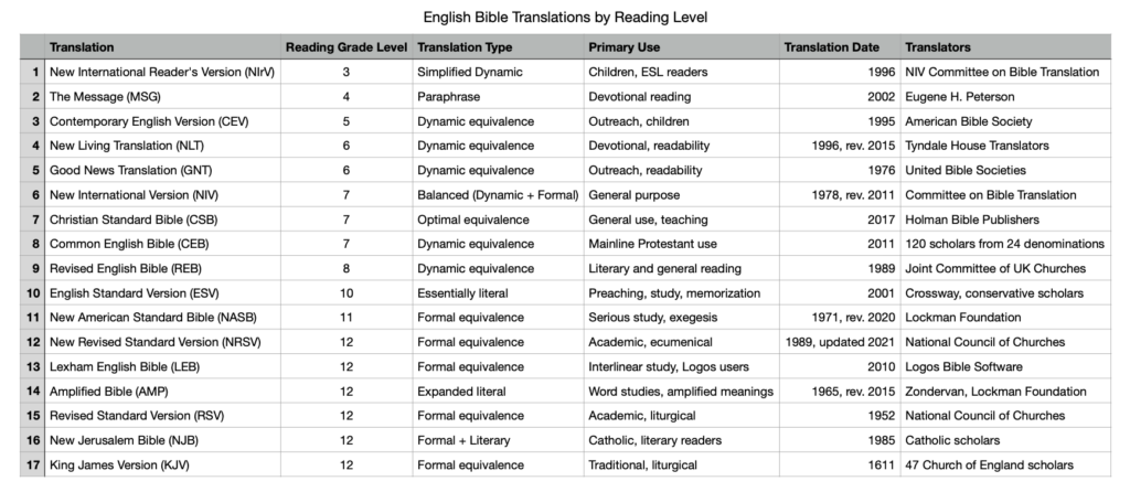 English Bible Translation by Reading Level